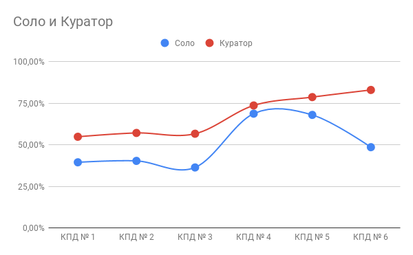 - Процент участников, вовремя завершивших курс, у пакета «Куратор» всегда выше, чем у «Соло».
